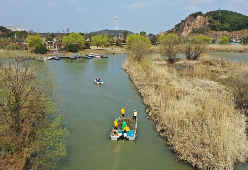 2021年2月24日,浙江湖州吳興區(qū)八里店鎮(zhèn)移沿山村河長(zhǎng)帶隊(duì)在移沿山村開(kāi)展巡河、保潔作業(yè)(無(wú)人機(jī)照片)。新華社記者 翁忻旸 攝