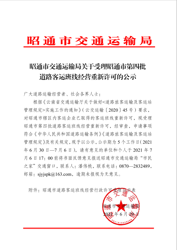 昭通市交通運(yùn)輸局關(guān)于受理昭通市第四批 道路客運(yùn)班線經(jīng)營重新許