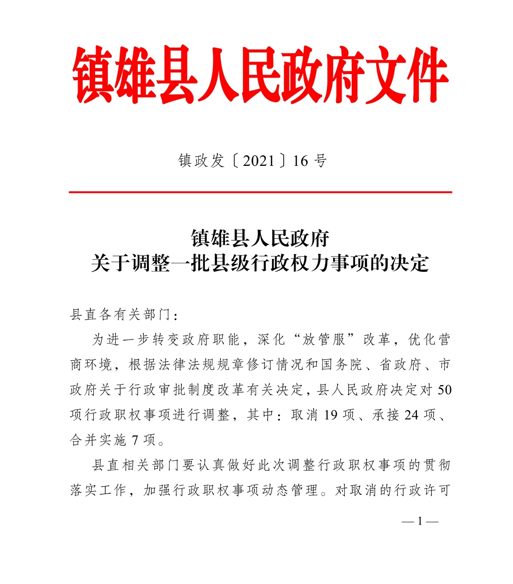 鎮(zhèn)雄縣人民政府關(guān)于調(diào)整一批縣級行政權(quán)力事項(xiàng)的決定