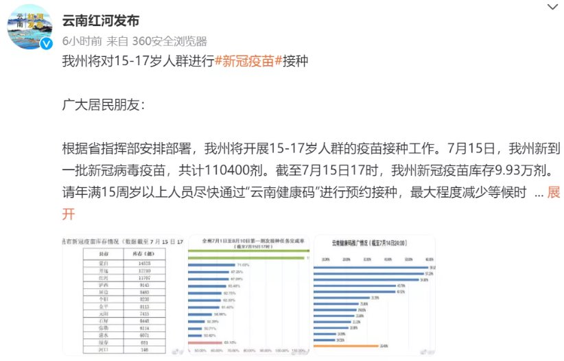 根據(jù)省指揮部安排部署,紅河州將開展15-17歲人群的疫苗接種工作。7月15日,紅河州新到一批新冠病毒疫苗,共計(jì)110400劑。截至7月15日17時(shí),紅河州新冠疫苗庫存9.93萬劑。