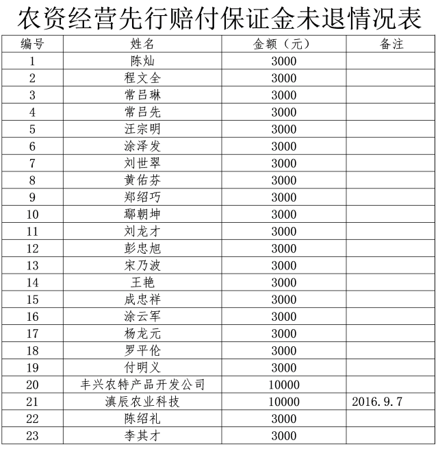 自2016年6月以來,我局對原鎮(zhèn)雄縣工商行政管理局收取的農(nóng)資先行賠付保證金、原鎮(zhèn)雄縣食品藥品監(jiān)督管理局收取的藥品經(jīng)營質量保證金進行清理退還。但截止目前,仍有一部分經(jīng)營業(yè)主未到我局辦理清退手續(xù),請還未辦理清退手續(xù)的經(jīng)營業(yè)主自本公告之日起60日之內(nèi)到我局財務室辦理保證金退還業(yè)務,逾期我局將按相關規(guī)定將款項上交財政。