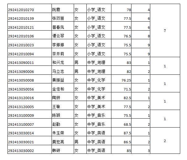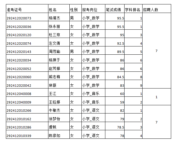 面試人員分崗位學(xué)科,按筆試成績從高到低,按不低于1:1.2的比例(進(jìn)一法)確定,若最后一名筆試成績出現(xiàn)并列,并列人員一并進(jìn)入面試。本次招聘進(jìn)入面試32人,名單如下: