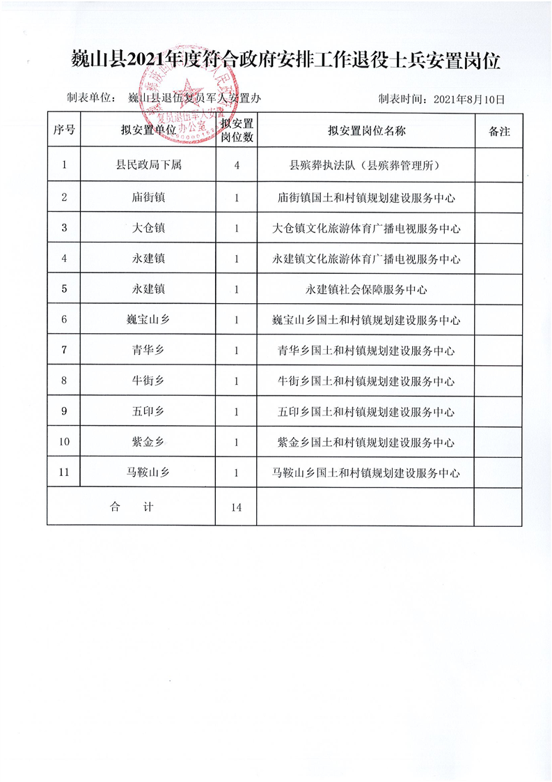 大理州巍山彝族回族自治縣復(fù)員退伍軍人安置辦公室關(guān)于巍山縣2021年退役士兵安置崗位的通告