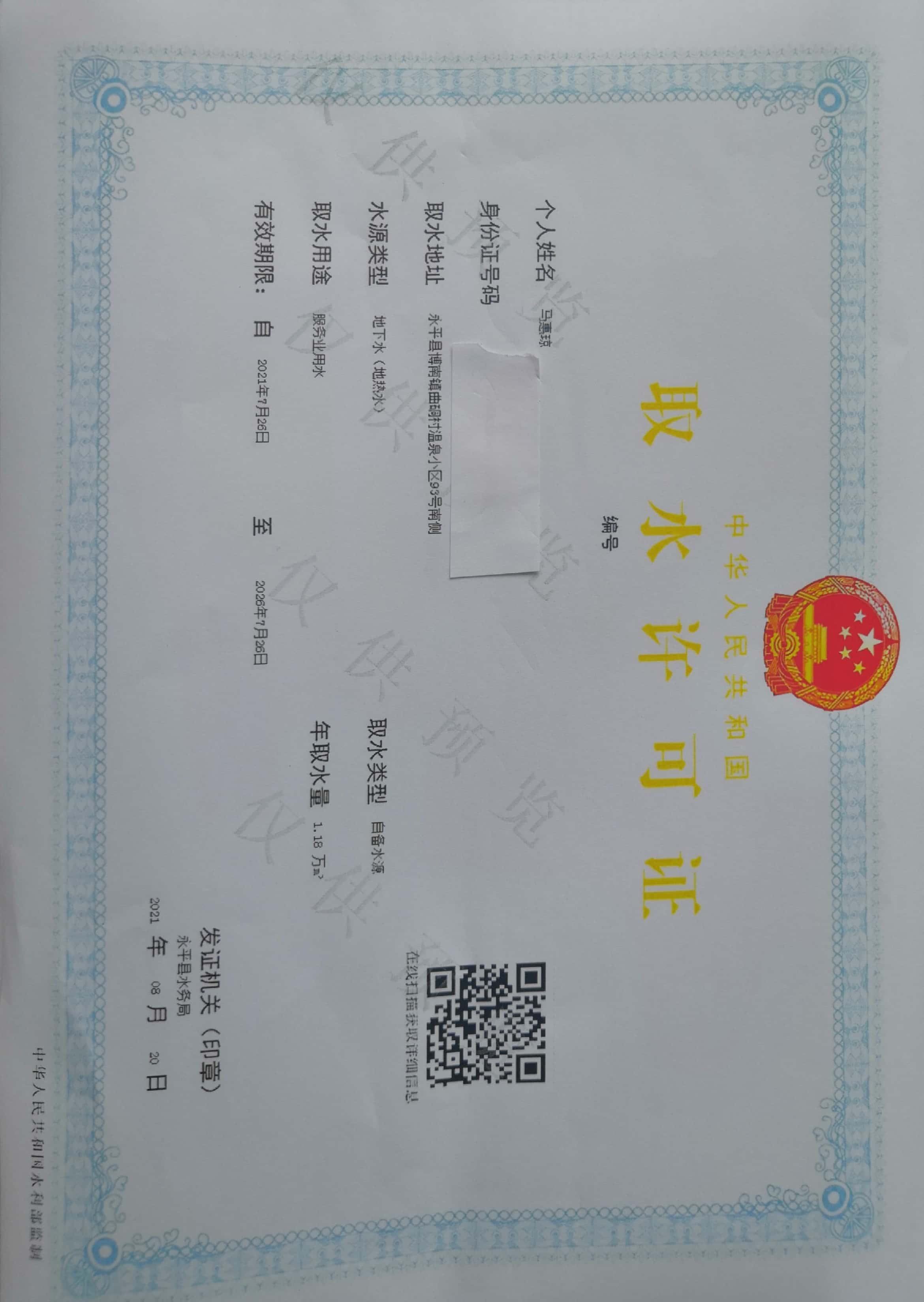 一、同意給予永平惠瓊百貨經(jīng)營部溫泉取水工程核發(fā)取水許可證。取水地點(diǎn)、取水量、退水地點(diǎn)、退水量、取水用途及最小生態(tài)下泄流量等嚴(yán)格按照《永平縣水務(wù)局關(guān)于準(zhǔn)予永平惠瓊百貨經(jīng)營部溫泉取水工程取水許可申請的行政許可決定書》(永水許〔2021〕20號)執(zhí)行。