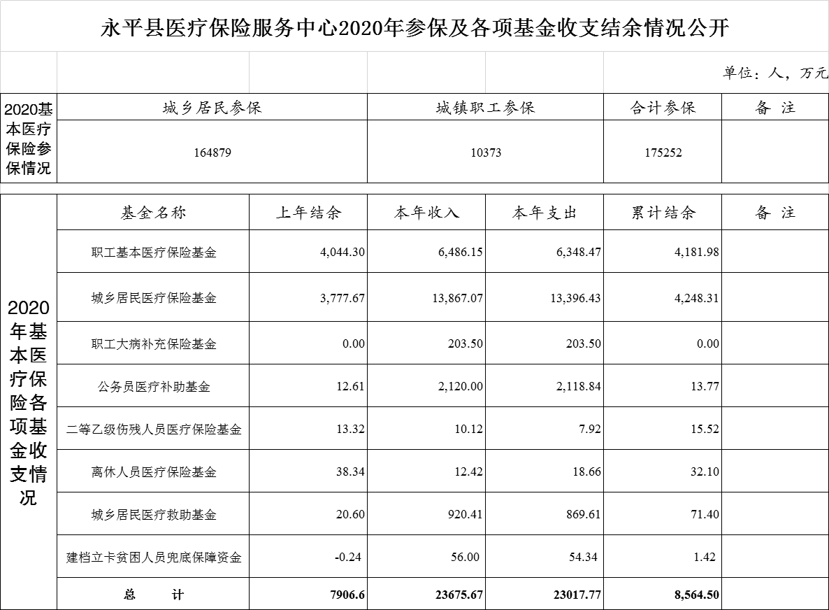 大理市永平縣醫(yī)療保險服務中心2020年參保及各項基金收支結(jié)余情況公開