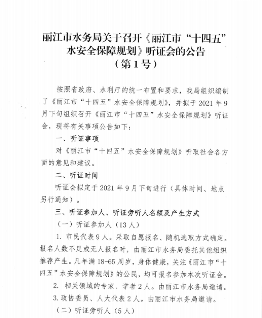 麗江市水務(wù)局關(guān)于召開《麗江市“十四五”水安全保障規(guī)劃》聽證會(huì)公告