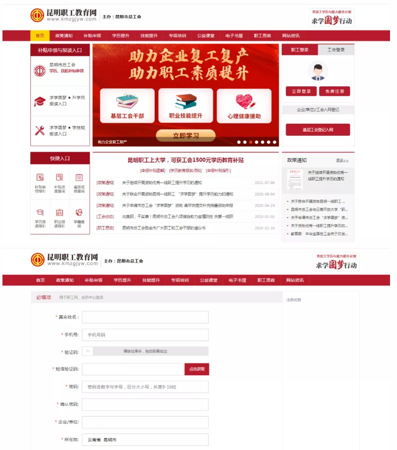 【通道二】瀏覽器昆明市職工教育網(wǎng),右側職工登錄——立即登錄。未注冊賬號職工在網(wǎng)站填寫注冊資料完成注冊;已注冊賬號職工在右側的登錄界面進行登錄。