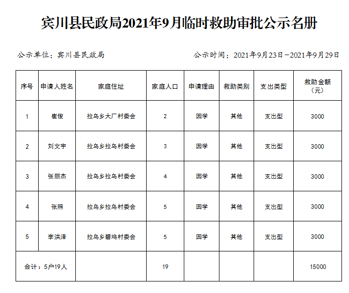 大理市賓川縣民政局2021年9月臨時(shí)救助審批公示
