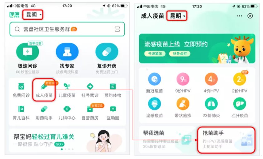 第一步:進(jìn)入官網(wǎng)后,選擇“昆明”地區(qū),點擊首頁“成人疫苗”,進(jìn)入頁面后再點擊“搶苗助手”;