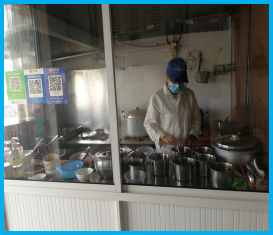 1.明廚亮灶,下載并展示餐飲安心碼,上崗人員操作規(guī)范并整齊穿戴工作衣帽、口罩;