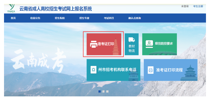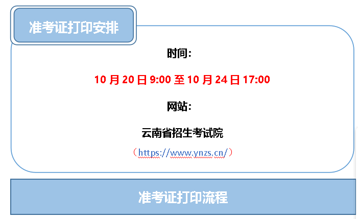 2021年10月20日9:00起,考生可登錄云南省招生考試院網(wǎng)站打印準考證。具體操作流程如下: