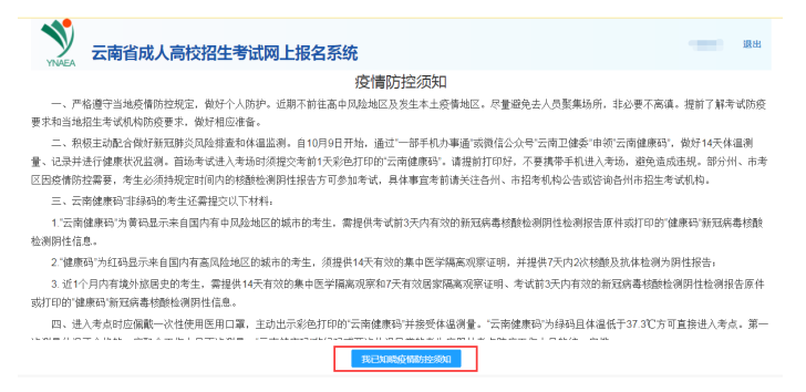 5.這時考生要注意頁面通知內(nèi)容,認真閱讀《疫情防控須知》,點擊“我已知曉疫情防控須知”按鈕。