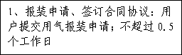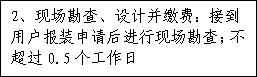 對已供氣小區(qū)的客戶的管道安裝(零星掛表),在客戶提交用氣需求并完成繳費(fèi)后3個(gè)工作日內(nèi)完成通氣點(diǎn)火工作。