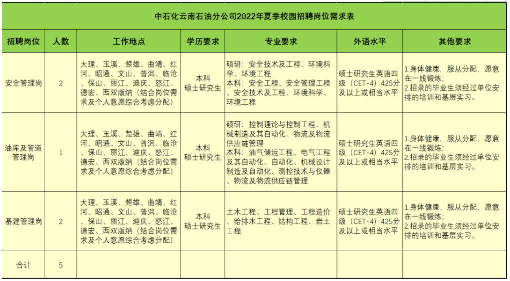 中國石化銷售股份有限公司云南石油分公司(以下簡稱中石化化云南石油分公司)作為中國石化直屬企業(yè),2022年夏季校園招聘計劃為5人。本次夏季校園招聘工作現(xiàn)已啟動,請有意向的畢業(yè)生按以下要求報名。