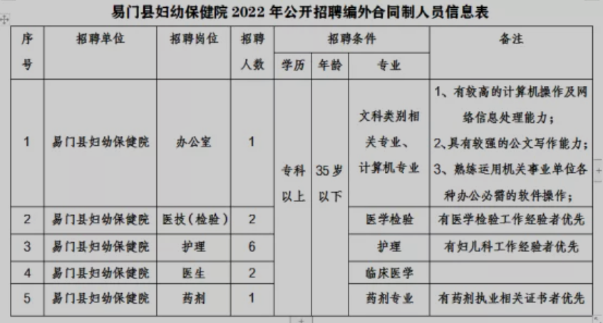 玉溪市易門縣婦幼保健院2022年編外人員招聘公告