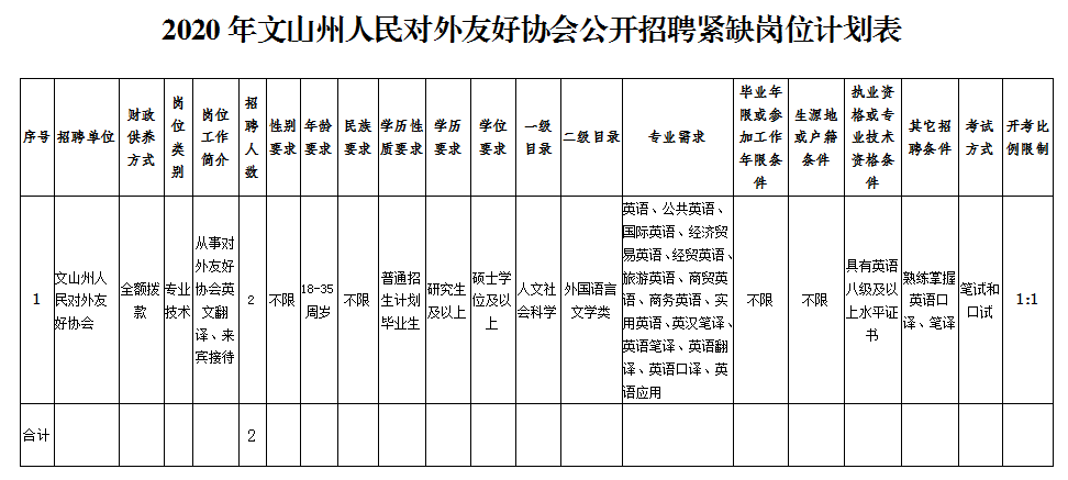 本次招聘崗位為文山州人民對(duì)外友好協(xié)會(huì)英語翻譯,招聘人數(shù)2人,負(fù)責(zé)友好協(xié)會(huì)具體工作,兼顧外事工作,具體崗位、人數(shù)、資格條件等詳見下表。