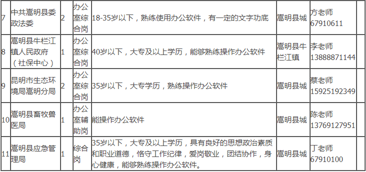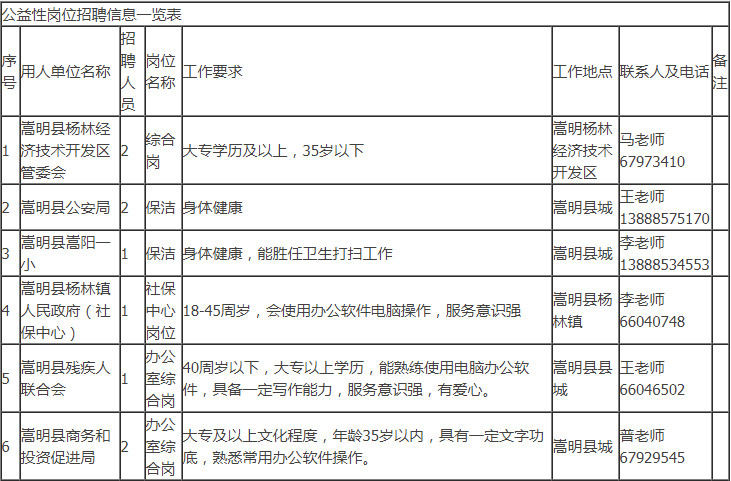 招聘具體事宜請咨詢用人單位。符合公益性崗位上崗條件的個人也可以到嵩明縣勞動就業(yè)服務局綜合科申請公益性崗位求職登記,詳詢陳老師:0871-67917444。