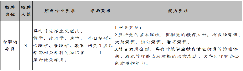為適應學校發(fā)展的需要,需面向社會誠聘3名專職輔導員,現(xiàn)將有關事項公告如下:
